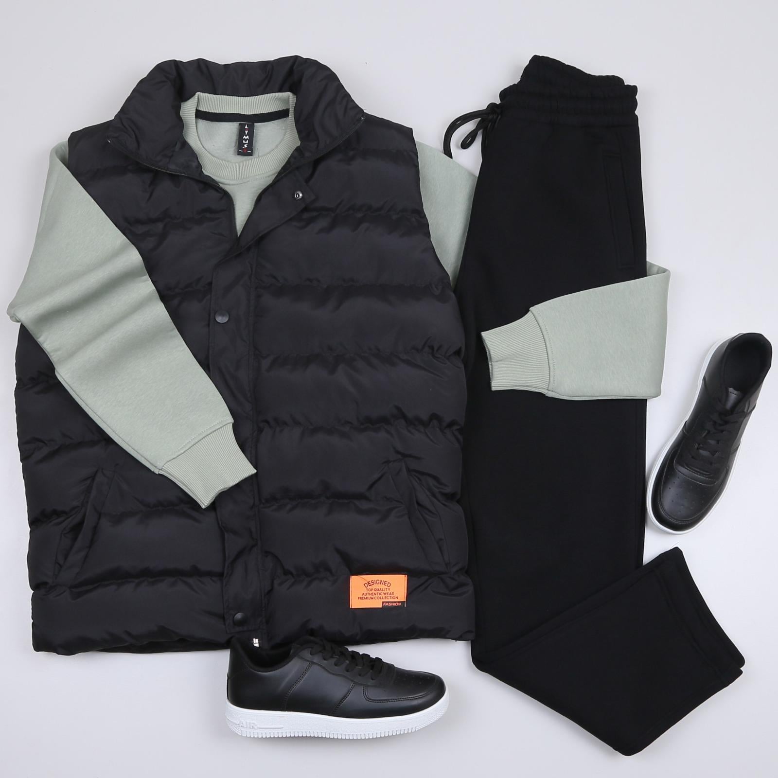 Siyah Şişme Yelek Sweatshirt Eşofman Ayakkabı Kombin