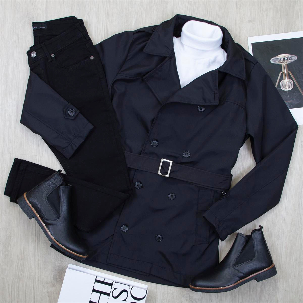 Siyah Trençkot Boğazlı Body Pantolon Bot Kombin