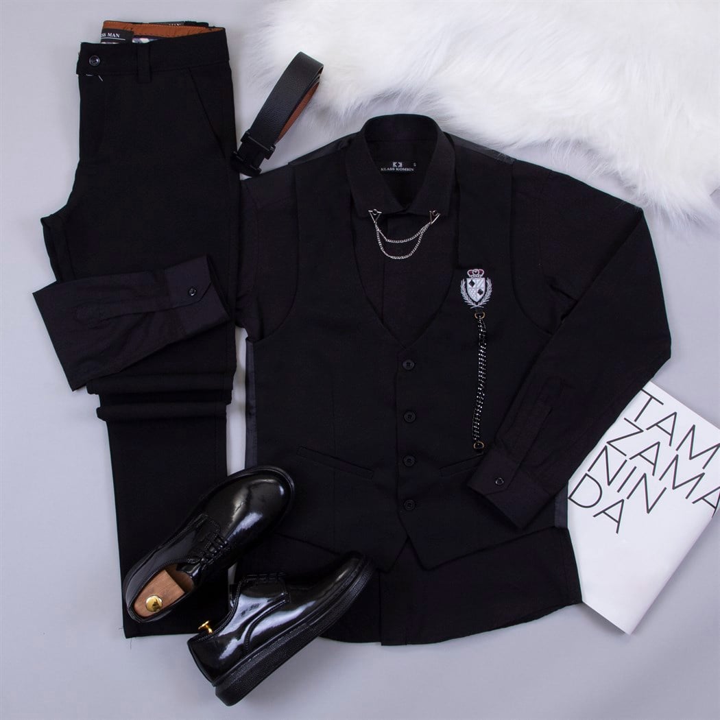 Siyah Zincirli Yelek Gömlek Pantolon Ayakkabı Kombin