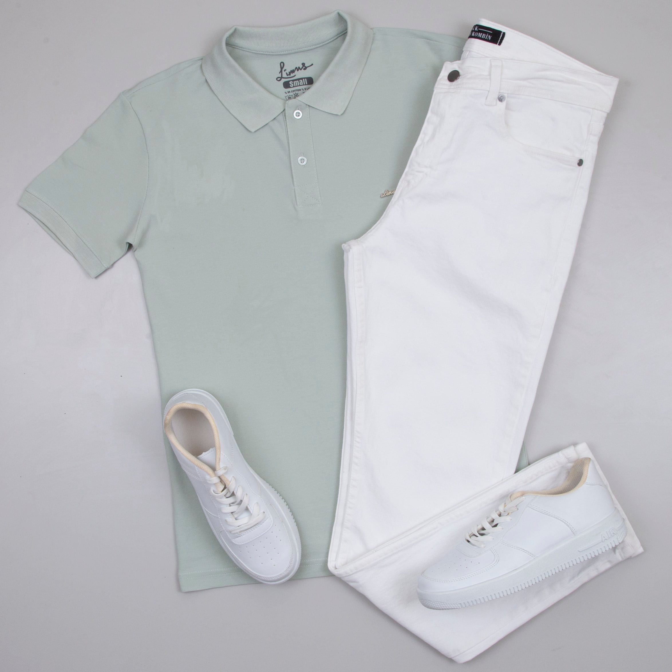 Su Yeşili Polo Yaka Tişört Beyaz Kot pantolon ayakkabı Kombin