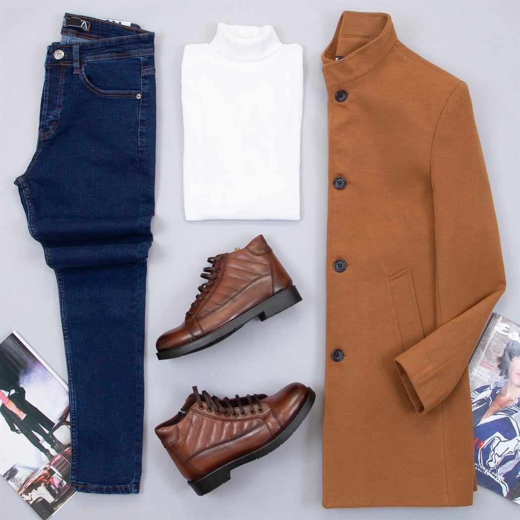 Taba Kaşe Kaban Boğazlı Kazak Pantolon Bot Kombin