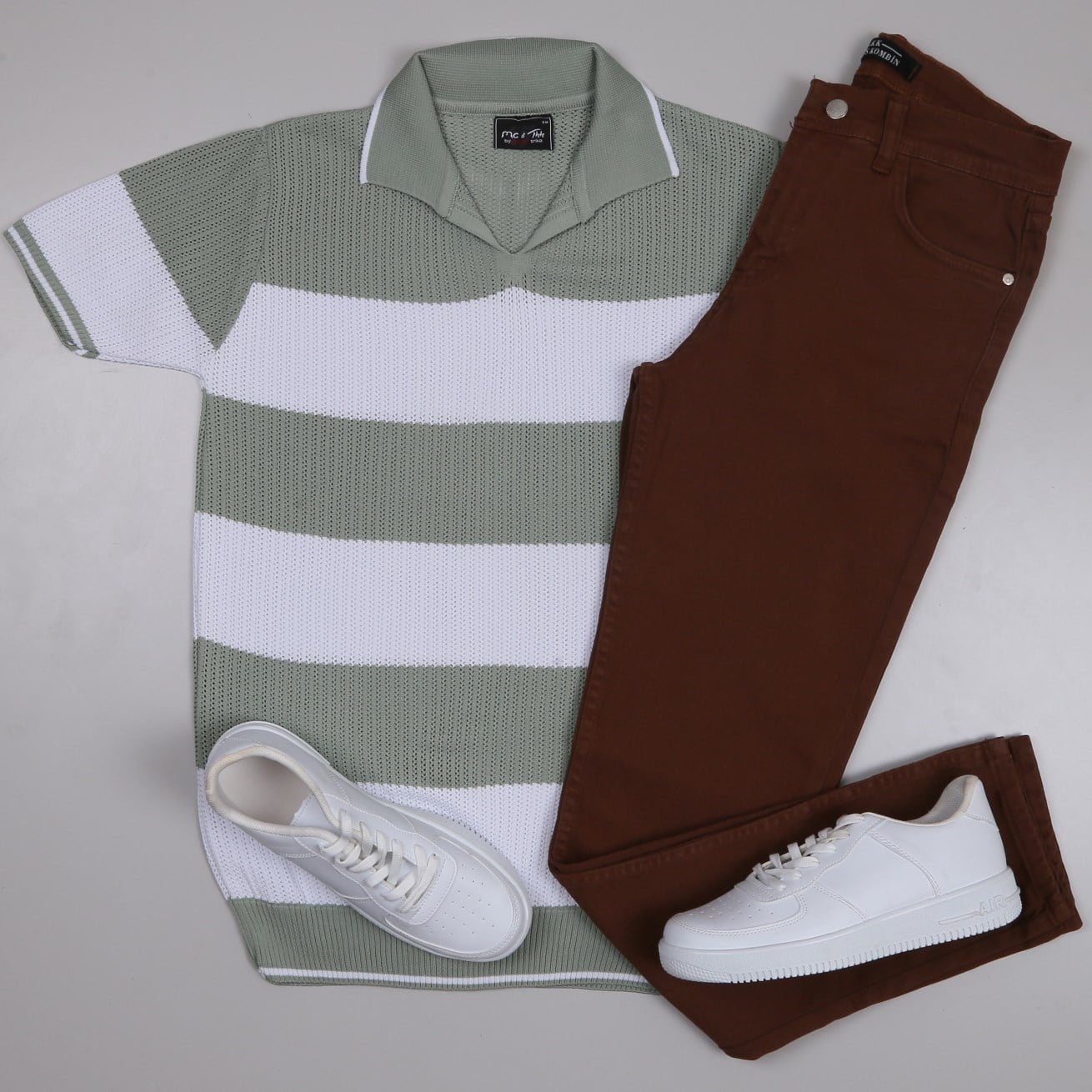 yeşil çizgili Triko Polo Yaka Tişört kahve kot pantolon ayakkabı Kombin