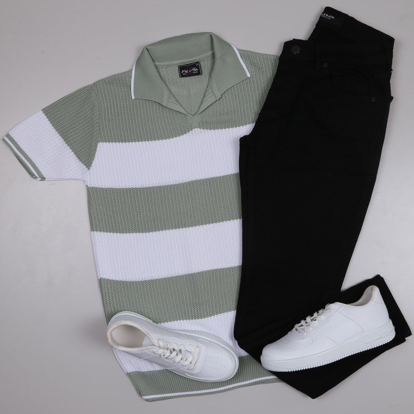 yeşil çizgili Triko Polo Yaka Tişört siyah kot pantolon ayakkabı Kombin